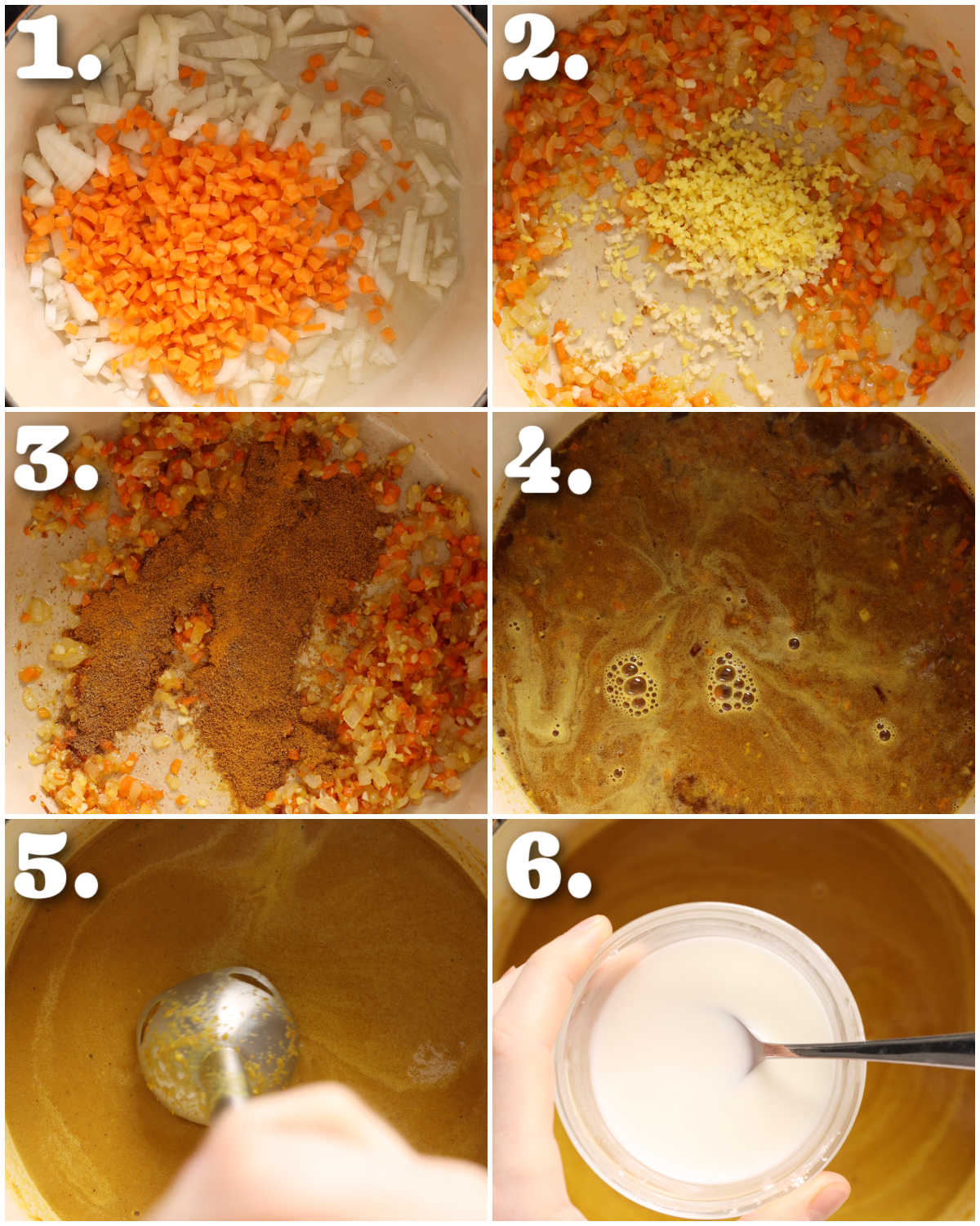 Process shots: fry onion and carrot (photo 1), fry ginger and garlic (photo 2), fry spices (photo 3), add stock, soy sauce and honey (photo 4), blitz (photo 5), thicken (photo 6).